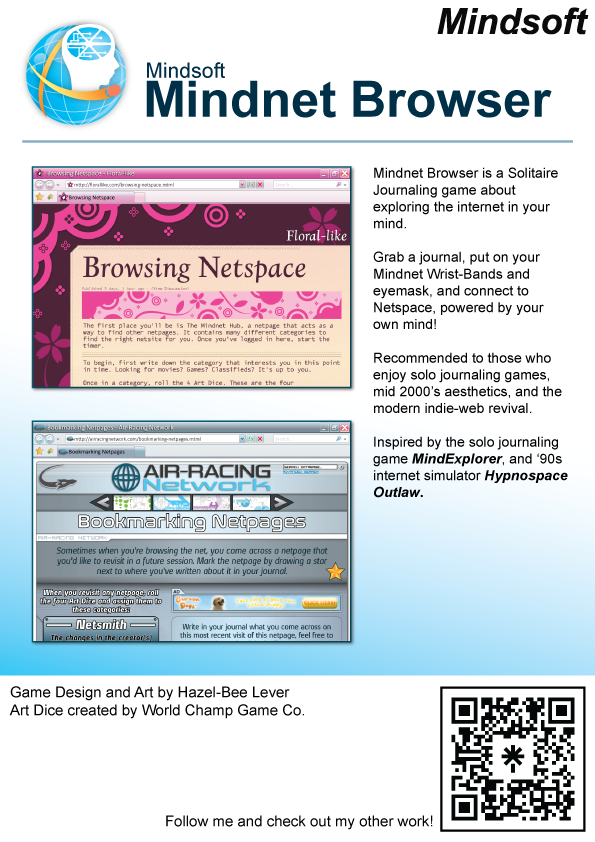 Mindnet Browser is a solitaire journaling TTRPG where you roll and interpret dice to create an interconnected internet within your mind. Designed to be played with the Art Dice by World Champ Game Co., which you can download from here, or use the digital version created by Michael Klamerus here.